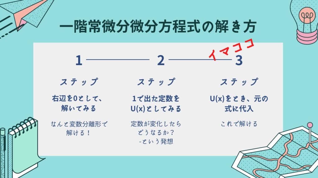 今回は、一階常微分方程式の中で最も基礎と言える、定数変化法を扱っていきます。